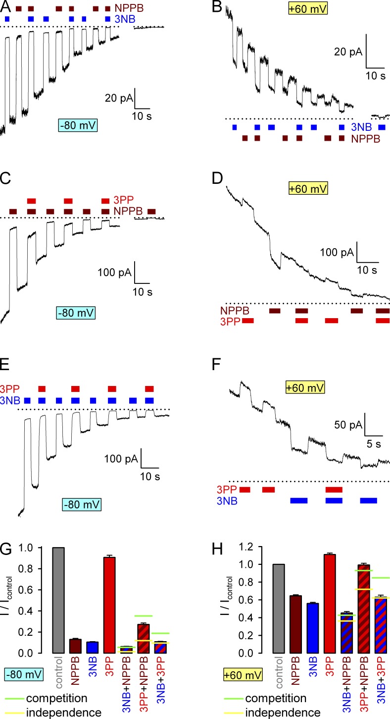 Figure 4. Competition for CFTR pore block between NPPB, 3NB, and 3PP. (A–F) Responses of decaying macroscopic locked-open K1250A CFTR currents, recorded at membrane potentials of −80 (A, C, and E) or 60 mV (B, D, and F), to brief exposures to the following drug combinations: (A and B) 32 mM 3NB (blue bars) and/or 210 µM NPPB (brown bars), (C and D) 20 mM 3PP (red bars) and/or 210 µM NPPB (brown bars), and (E and F) 32 mM 3NB (blue bars) and/or 20 mM 3PP (red bars). Zero-current levels (dotted lines) were estimated from the responses of final current segments to application of either 32 mM 3NB or 210 µM NPPB. (G and H) Fractional currents, normalized to control (gray bars), recorded at −80 mV (G) or 60 mV (H) membrane potentials in the presence of 210 µM NPPB (brown bars), 32 mM 3NB (blue bars), 20 mM 3PP (red bars), or their combinations (striped bars, same color coding). Horizontal lines illustrate fractional currents predicted for mixtures (see Materials and methods), assuming either completely independent (yellow lines) or mutually exclusive (green lines) binding of the two drugs in the pore. Mean ± SEM is shown. |