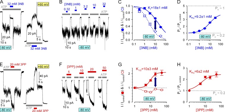 Figure 5. Voltage-independent stimulation of CFTR open probability by both 3NB and 3PP. (A and E) Macroscopic WT CFTR currents in 2 mM ATP (gray bars) at −80 (left traces) and 60 mV (right traces) and brief exposures to 32 mM 3NB (A, blue bars) or 20 mM 3PP (E, red bars). (B) Responses of macroscopic WT CFTR currents, elicited at −80 mV by repeated exposures to 2 mM ATP (gray bars), to applications of increasing concentrations of 3NB (blue bars). (F) Macroscopic WT CFTR currents elicited at −80 mV by exposures to 2 mM ATP (gray bars) either in the absence or in the presence (red bars) of various concentrations of 3PP. (C and G) Dose dependence of fractional currents on 3NB (C) and 3PP (G) concentrations at −80 mV (closed symbols) and Hill fits (solid lines; midpoints printed in the panels); open symbols and dotted lines show dose dependence of pore block, replotted from Fig. 3 (C and H). (D and H) Gating stimulation by 3NB (D) and 3PP (H) at −80 mV; Po/Po;control was calculated as the ratio (I/Icontrol)/(i/icontrol). Control Po (dotted lines), estimated for single WT channels under identical conditions (see Fig. 7 C), is ∼0.2. Mean ± SEM is shown. |