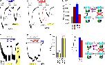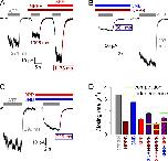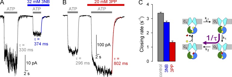 Figure 6. Effects of 3NB and 3PP on macroscopic closing rate of WT CFTR. (A and B) Macroscopic WT CFTR currents at −80 mV, elicited by brief applications of 2 mM ATP (gray bars) in the absence of drug or in the presence of either 32 mM 3NB (A, blue bar) or 20 mM 3PP (B, red bar). All four current decay time courses after ATP removal were fitted by single exponentials (colored lines), and time constants are indicated. (C) Macroscopic closing rates, obtained as the inverses of fitted time constants (see Materials and methods), under control conditions (gray bar) or in the presence of either 32 mM 3NB (blue bar) or 20 mM 3PP (red bar). Mean ± SEM is shown. Cartoon in C (also in Fig. 7 B; Fig. 8, C and G; and Fig. 10) depicts simplified cyclic CFTR gating model: cyan, TMDs; green, NBD1; blue, NBD2; yellow, ATP; red, ADP. Purple arrow highlights the pathway under study. |