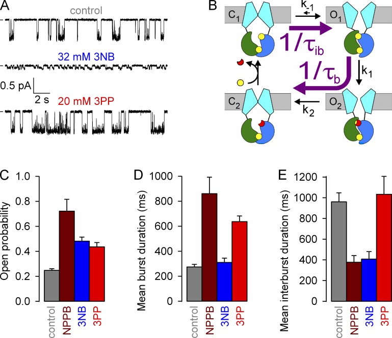 Figure 7. Effects of NPPB, 3NB, and 3PP on WT CFTR microscopic steady-state gating parameters. (A) Currents from single WT CFTR channels at −80 mV in 2 mM ATP (top), 2 mM ATP + 32 mM 3NB (middle), and 2 mM ATP + 20 mM 3PP (bottom); bandwidth, 50 Hz. (B) Cartoon gating model; opening rate (top purple arrow) and closing rate (bottom purple arrow) are given by 1/τib and 1/τb, respectively. (C–E) Open probabilities (C) and mean burst (τb; D) and mean interburst (τib; E) durations in 2 mM ATP (gray), 2 mM ATP + 210 µM NPPB (brown), 2 mM ATP + 32 mM 3NB (blue), and 2 mM ATP + 20 mM 3PP (red). The data for NPPB (brown bars) are replotted from Csanády and Töröcsik (2014) and reflect values measured at 60 mV. Mean ± SEM is shown. |