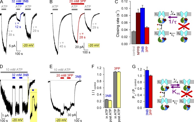 Figure 8. Effects of 3NB and 3PP on gating rates under nonhydrolytic conditions. (A and B) Macroscopic K1250A CFTR currents at −20 mV, elicited by exposures to 10 mM ATP (gray bars) in the absence of drug or in the presence of either 32 mM 3NB (A, blue bar) or 20 mM 3PP (B, red bar). All current decay time courses after ATP removal were fitted by single exponentials (colored lines), and time constants are indicated. (C) Macroscopic closing rates (bars; 1/τ; see Materials and methods) in the absence (gray bar) or presence of 32 mM 3NB (blue bar) or 20 mM 3PP (red bar) quantify effects on rate k−1 (cartoon, purple arrow). The K1250A mutation (cartoon, red stars) disrupts ATP hydrolysis in site 2 (red cross). (D and E) Macroscopic K1250A CFTR currents elicited by 10 mM ATP at −20 mV and prolonged exposures to 32 mM 3NB (D, blue bars) or 20 mM 3PP (E, red bars) of channels gating at steady-state. Zero-current levels (dotted lines) were estimated from final segments. In D, brief exposure to 3NB of surviving locked-open channels after ATP removal (20-s yellow box, expanded in inset) measures fractional pore block (see Fig. 3). (F) Fractional K1250A CFTR currents at −20 mV in 32 mM 3NB (left pair of bars) or 20 mM 3PP (right pair of bars) applied during steady-state gating (gray bars) or in the locked-open state (yellow bars). (G) Effects of 3NB (blue bar) and 3PP (red bar) on the closed-open equilibrium (cartoon, purple double arrow). Fractional effects on Po for K1250A CFTR were calculated as in Fig. 5 (D and H). Mean ± SEM is shown. |