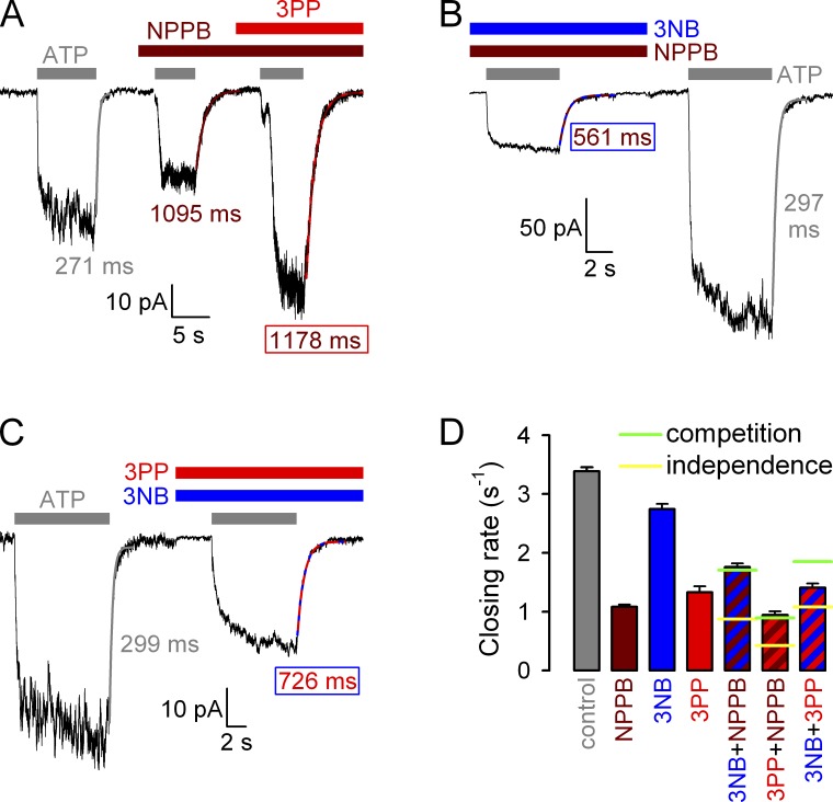 Figure 9. Competition between NPPB, 3NB, and 3PP for affecting hydrolytic closing rate. (A–C) Macroscopic WT CFTR currents at −80 mV, elicited by brief applications of 2 mM ATP (gray bars) in the absence of drug, or in the presence of either 210 µM NPPB (A, brown bar) or the following drug combinations: (A) 20 mM 3PP (red bar) plus 210 µM NPPB (brown bar), (B) 32 mM 3NB (blue bar) plus 210 µM NPPB (brown bar), and (C) 32 mM 3NB (blue bar) plus 20 mM 3PP (red bar). Current decay time courses after ATP removal were fitted by single exponentials (colored lines), and time constants are indicated. (D) Macroscopic closing rates, obtained as the inverses of fitted time constants (see Materials and methods), under control conditions (gray bar) or in the presence of 210 µM NPPB (brown bar), 32 mM 3NB (blue bar), or 20 mM 3PP (red bar), or their combinations (striped bars, same color coding). Horizontal lines illustrate the predicted closing rates in mixtures (see Materials and methods), assuming either completely independent (yellow lines) or mutually exclusive (green lines) binding of the coapplied drugs at their respective gating sites. Blue and red bars were replotted from Fig. 6 C. Mean ± SEM is shown. |