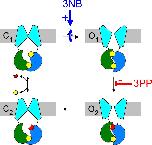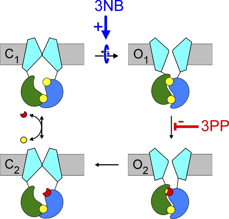 Figure 10. Cartoon summary of 3NB and 3PP gating effects. 3NB acts as a pure catalyst for the C1↔O1 transition (blue arrow), thereby increasing channel opening rate and nonhydrolytic closing rate. 3PP acts to inhibit the ATP hydrolysis step (red line). Both effects independently stimulate Po for WT CFTR, but neither effect changes Po for a nonhydrolytic mutant. NPPB exerts both effects at the same time, resulting in extremely efficacious stimulation of Po for WT (and ΔF508) CFTR (Csanády and Töröcsik, 2014). |