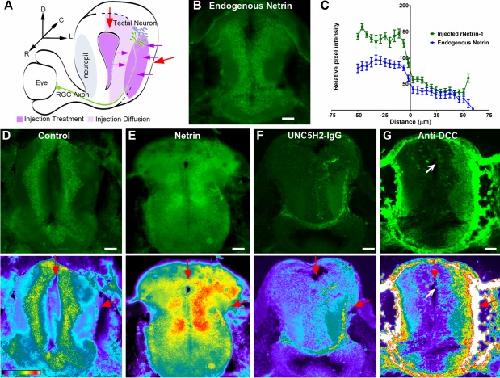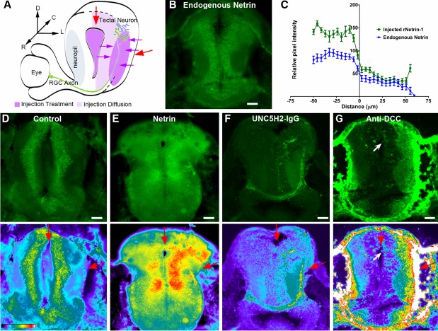Fig. 3 Protein diffusion after treatment. a Schematic of coronal view of stage 45 Xenopus retinotectal circuit depicting injection sites (red arrows) and spread of injected proteins (violet color). b Coronal section at the level of the optic tectum immunostained with antibodies to netrin-1. Note endogenous netrin immunoreactivity in cell body layer and neuropil. câg Sections at the level of the optic tectum of tadpoles injected with vehicle, recombinant netrin-1, UNC5H2-Ig, or anti-DCC were immunostained to examine the spread of the injected proteins after treatment. c Quantitative analysis of fluorescence intensity in sections of uninjected tadpoles (Endogenous Netrin) or tadpoles injected with recombinant netrin (Injected rNetrin-1). The relative levels of netrin within the cell body layer and the neuropil are illustrated by the average pixel intensity values along the medial-to-lateral axis of the tectum. The zero value in the X-axis corresponds to the cell body layer-neuropil boundary; negative X-coordinates represent distance from the boundary to the ventricle while positive X-coordinates represent distance from the boundary to the lateral-most neuropil. n = 10 brain sections per group, from four tadpole brains per group, with three 20-pixel-wide line scans quantified per section. Error bars represent the standard error of the mean. dâg Sample coronal sections of tadpoles injected with vehicle (d), recombinant netrin-1 (e), UNC5H2-Ig (f), or anti-DCC (g) immunostained with chick antibodies to netrin-1 and Alexa 488 secondary antibodies to chick IgG (top; d, e) or stained with Alexa 488 secondary antibodies to human IgG (top; f) or mouse IgG (top; g). The pseudo-color images in dâg (bottom) show the relative intensity of the Alexa fluor 488 fluorescence. Pixel intensity values ranged from 0 (black) to 255 (white) as illustrated by the color-scale bar (d, bottom). Note the increased immunofluorescence in the cell body layer and neuropil of netrin-1-treated tadpoles (e) when compared to vehicle-injected controls (d) and with endogenous netrin-1 expression (b). In f and g, the relatively higher fluorescence intensity in the hemisphere that received the injection (red arrows) and the diffusion patterns of the proteins are more evident in the pseudo-color images. In g, white arrows point to fluorescently labeled cells in the injected tectal hemisphere. Scale bars in b, dâg: 50 μm |
