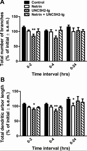 Fig. 5 Altering endogenous netrin levels decreases dendrite branch number and total dendritic arbor length. Effects of tectal microinjection of netrin, UNC5H2-Ig, or netrin + UNC5H2-Ig on total dendrite branch number (a) and length (b). Netrin-1 and UNC5H2-Ig altered tectal neuron morphology with a different time scale. Note that exogenous netrin-1 treatment decreased dendrite arbor length at 24 h, while the UNC5H2-Ig treatment that sequesters endogenous netrin induced a transient but significant decrease in branch number at the 0- to 2- and 0- to 4-h imaging intervals when compared to all other treatments. Co-treatment with netrin + UNC5H2-Ig did not influence branch number or length. Values are expressed as percent change from the initial 0-h imaging session. Two-way ANOVA with Bonferroni multiple comparison test; *p < 0.05, **p < 0.01. Error bars indicate SEM |