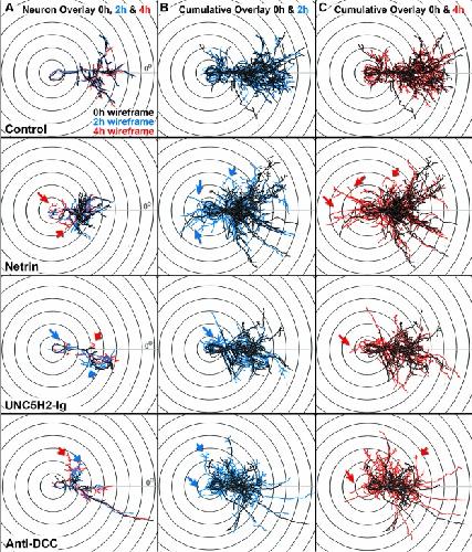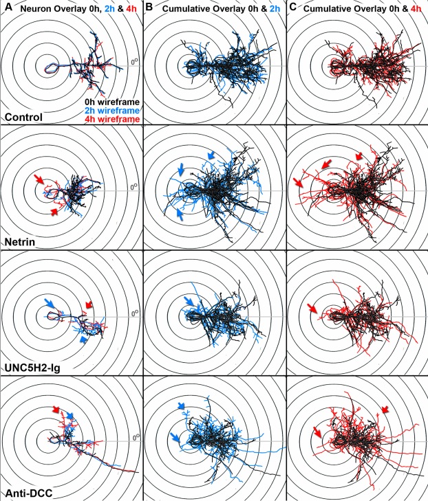 Fig. 10 Overlays of sample neurons at 0, 2, and 4 h illustrate changes in dendritic arbor morphology in response to treatment and between imaging intervals. a Confocal stacks of individual neurons from control, netrin-1-, UNC5H2-Ig-, and anti-DCC-treated tadpoles were reconstructed with MetaMorph creating three-dimensional wireframes of each stack. Wireframes were color-coded based on imaging time point (black, 0 h; blue, 2 h; red, 4 h), overlapped, and aligned over Scholl concentric circles with the primary dendrite placed at a 0° angle (X-axis; gray line). Dynamic changes in dendritic morphology every 2 h over a 4-h imaging period are illustrated by the emergence of blue (2 h) or red branches (4 h) from under the black wireframe (0 h). b, c Cumulative wireframes from a subset of seven neurons per condition better illustrate the dynamic changes in growth between the 0- and 2-h imaging interval (b), and the 0- and 4-h imaging interval (c), for each treatment group. Large arrows point to sample ectopic branches newly extended at the time point indicated by the color of the arrow (blue, 2 h; red, 4 h). Short arrows point to already established branches that changed their directionality of growth at the time point indicated by the color of the arrow (blue, 2 h; red, 4 h) |