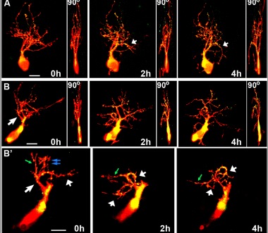Fig. 12 Individual branches change their orientation of growth in response to altered netrin levels. a, b The maximum projections of each confocal z-stack of two sample neurons at the 0-, 2-, and 4-h imaging time points, and the corresponding 90° view of each threedimensional z-stack, illustrate the dynamic changes in growth and directionality of individual dendrites in response to acute netrin-1 treatment. The neuron in a corresponds to that shown in Fig. 5b. b’ For the sample neuron in b, a single primary dendrite and its individual secondary branches of the same neuron can be discerned in the higher magnification images by selecting and projecting only the z-planes from each confocal stack that include that branch. By isolating the individual dendrite from the rest of the dendritic arbor, one can better differentiate the change in the direction of growth of the primary dendrite (short white arrows) that took place while some of its secondary branches were pruned (double blue arrows) or changed their direction of growth (green arrow) and others were maintained. Scale bars: 20 μm |