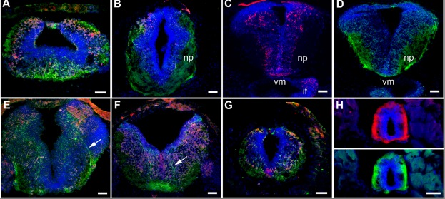 Fig. 2 Specific patterns of DCC and UNC-5 expression in the X. laevis central nervous system. Immunostaining with antibodies to UNC-5 (red) and DCC (green) revealed specific patterns of expression of the netrin-1 receptors in stage 45 tadpoles. a–g UNC-5 (red) and DCC (green) immunoreactivity in the forebrain (a), pre-tectum (b), caudal tectum (e), hindbrain (f), and rostral spinal cord (g) demonstrate a specific pattern of expression for each of these receptors within subpopulations of neurons in the central nervous system. c UNC-5 immunostaining (red) localizes to subpopulations of neurons in the dorsal tectum, lateralventral midbrain, ventral midline (vm), and infundibulum (if). d DCC immunoreactivity (green) is localized in dorsal tectal neuron cell bodies and processes in the tectum and ventral midline, as well as in the tectal neuropil (np). e, f Note the specificity of immunostaining and co-localization of UNC-5 and DCC expression in subpopulations of cells in the caudal tectum (e) and hindbrain (f) and the localization of DCC receptors to discrete fiber tracts (arrows). g, h UNC-5 (red) and DCC (green) immunoreactivity in the rostral (g) and caudal (h) spinal cord is localized to fiber tracts and ventral midline in agreement with published observations in Xenopus and other species (for review, see [42, 5, 43–45]). DCC immunoreactivity in the spinal cord is similar when staining with antibodies directed against the extracellular (g) or intracellular (h, bottom) domains of DCC. Counterstaining with DAPI (blue) serves to distinguish nuclear staining from UNC-5 (red) and DCC (green) expression in cell bodies and fiber tracts. Scale bars: 50 μm |