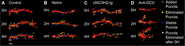 Fig. 8 Altered netrin-1 levels and DCC signaling impact postsynaptic cluster remodeling. a–d Confocal projections of single branches from representative tectal neurons co-expressing tdTomato (red) and PSD95-GFP (green) from control (a), netrin (b), UNC5H2-Ig (c), or Anti-DCC (d) groups before and after treatment. Dynamic remodeling of postsynaptic specializations is illustrated by the addition (green arrowheads) and elimination (yellow arrowheads) of PSD95-GFP clusters. Blue arrowheads denote puncta that remained stable from one observation interval to the next; white arrowheads denote puncta that were present at the initial observation time point but were eliminated (yellow) at 2 h. Scale bar: 20 μm |