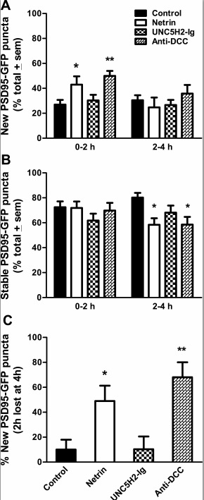 Fig. 9 Postsynaptic cluster addition and stabilization are modulated by alterations in netrin signaling. a, b Effects of netrin-1, UNC5H2-Ig, or anti-DCC treatments on postsynaptic cluster remodeling were quantified as the proportion of PSD95-GFP puncta that were added (a) and remained stable (b) within the 0–2 and 2–4 observation intervals. Note that significantly more PSD95-GFP puncta were between 0 and 2 h (a), while fewer were stable between 2 and 4 h (b) following netrin-1 or anti-DCC treatment when compared to controls. c To determine the relative stability of newly added postsynaptic clusters, we quantified relative proportion of PSD95-GFP puncta added over the 0- to 2-h interval that were lost in the subsequent 2- to 4-h interval for a subset of randomly selected neurons for each group (n = 4). PSD95-GFP puncta added from 0 to 2 h were significantly less stable in the netrin-1- or anti-DCC-treated neurons. Statistical significance was by one-way ANOVA and with unpaired t-tests. Significance when compared to control is *p < 0.05, **p < 0.01. Error bars indicate SEM |