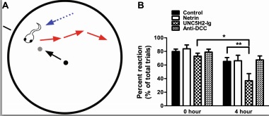 Fig. 13 Sequestration of endogenous netrin-1 with UNC-5 ectodomain affects swimming behavior in a visually guided task. a Schematic of the visual avoidance task viewed from above. Stage 45 tadpoles swim in the 60-mm open field (blue arrow and dotted line) while the Matlab program projects an image on the monitor where the petri dish rests. The black line outside the field represents the vector the 0.3-mm dot (small black circle) will travel. Every 30 s, the 0.3-mm dot appears in the center and is directed towards the black line to intercept the tadpole (black arrow). The tadpoleâs response to the advancing stimuli (gray circle) is video recorded and typically results in the tadpole changing its swimming velocity and/or direction (red arrows). b Reaction to the presentation of a moving visual stimulus for tadpoles before treatment (0 h) and 4 h after treatment with vehicle solution (control), netrin- 1, anti-DCC, or UNC5H2-Ig is shown as the percent of trials in which tadpoles showed an avoidance response. Tadpoles injected with UNC5H2-Ig had decreased avoidance responses to the presentation of the stimulus 4 h post-injection. Two-way, repeated measures ANOVA with Bonferroni multiple comparison test; *p < 0.05, **p < 0.01. Error bars indicate SEM |