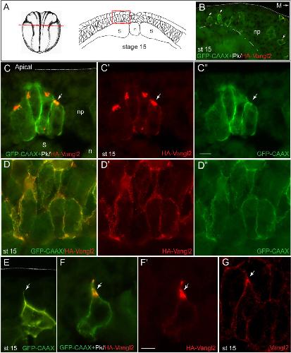 Fig. 5. Polarized distribution of PCP proteins in embryonic neuroectoderm. (A) Scheme of neurula stage embryo and a transverse section of the Xenopus neural plate at the hindbrain level. Dashed line indicates section plane. The boxed area indicates an approximate location of images. (B) Neural plate section with apically directed Vangl2/Pk complexes shown at low magnification. Eight-cell embryos were injected into animal-dorsal blastomeres with RNAs encoding HA-Vangl2, Pk and GFP-CAAX (0.1 ng each). The embryos were cultured until stage 15, cross-sectioned and immunostained with indicated antibodies. The apical surface is at the top as indicated by dashed lines. Midline (M) is to the right. Arrows point to the polarized Vangl2/Pk complex in deep neuroctodermal cells. (CâCâ²) The localization of the Vangl2/Pk complex in embyos coinjected with HA-Vangl2 and Pk RNAs as compared to the lineage tracer GFP-CAAX. np, neural plate; s, somite; n, notochord. Scale bar in Câ is 10 μm, also applies to (DâDâ²). (DâDâ²) HA-Vangl2 is not significantly polarized in the neural plate in the absence of overexpressed Pk. (E) A protrusion directed towards the outer surface (arrow) is detectable in a single GFP-CAAX-marked cell. (F, Fâ²) A single deep layer cell containing an apical protrusion with enriched Vangl2/Pk complex (arrow). Scale bar is 10 μm, also applies to E, G. (G) Staining of neuroectoderm with anti-Vangl2 antibodies reveals apically enriched endogenous Vangl2 in an inner layer cell. |