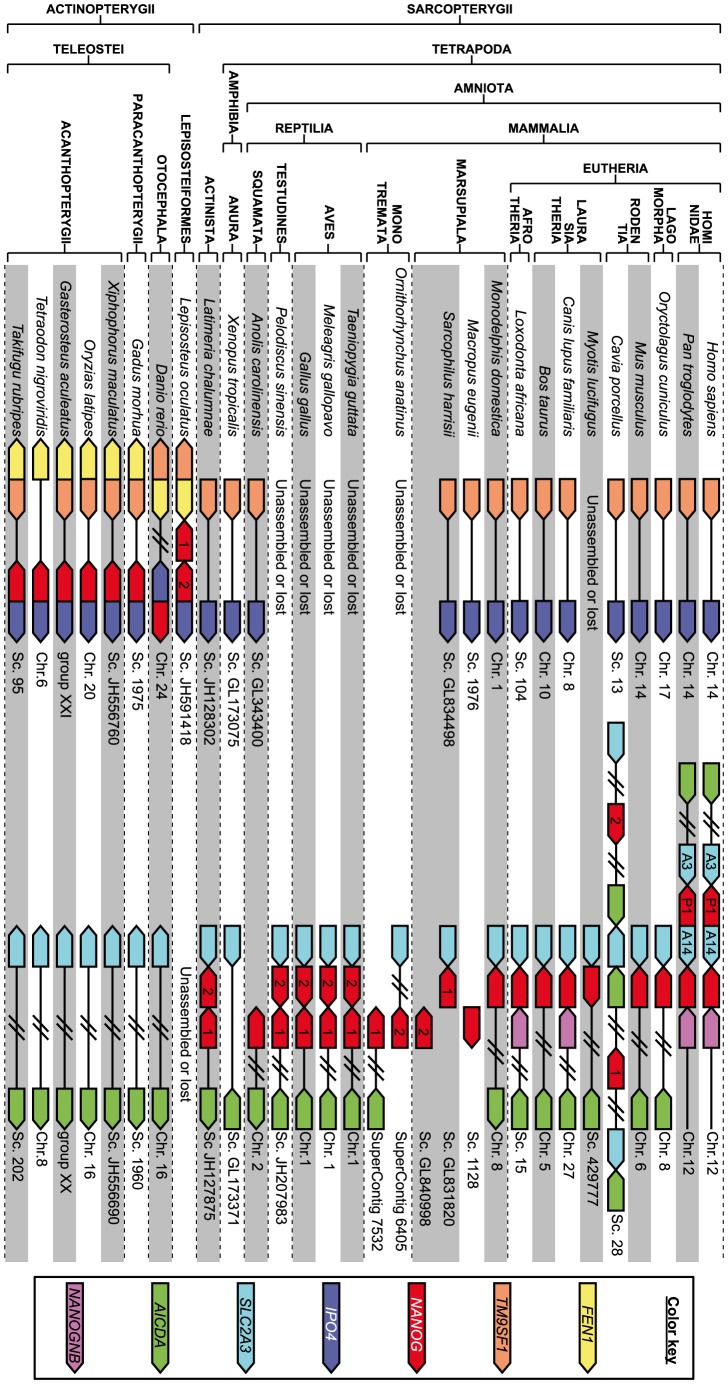 Figure 2. Simplified synteny of NANOG loci in osteichthyans.The synteny of the loci where NANOG orthologues are found in actinopterygians (TMSF9 - IPO4 region) and sarcopterygians (SLC2A3 - AICDA region) are shown on the left-hand and right-hand sides, respectively. The relevant chromosomes or gene scaffolds are given. The figure is not drawn to scale, “empty” spaces along the chromosomes (e.g. between TM9SF1 and IPO4 in sarcopterygians) do not reflect actual distances but are meant to facilitate comparisons. Double slashes (//) denote that intervening genes were omitted for simplicity (e.g. between FEN1 and IPO4 in Danio rerio). In species in which two NANOG paralogues were found, numbers indicate which paralogue was named “NANOG1” or “NANOG2” in this work (note that these names do not imply orthologous relationships). This region contains multiple paralogues of NANOG, AICDA and SLC2A3 in Guinea pig; and of both NANOG (NANOGP1, P1 on the figure) and SLC2A3 (named SLC2A14, A14 on the figure) in Hominidae. More detailed information regarding these two regions is listed in File S2, including coordinates for the genes presented on this figure.