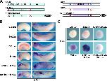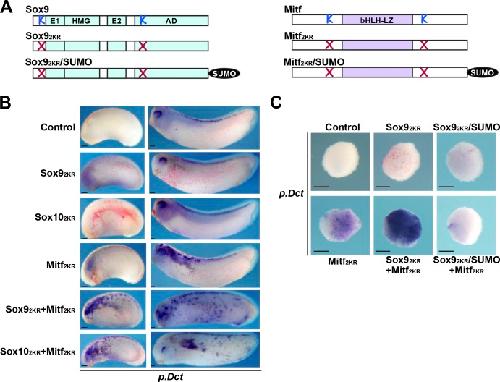 Figure 1. Effects of SoxE and Mitf isoforms on Dct expression in Xenopus embryos and animal caps. (A) Schematic of SoxE and Mitf proteins and SUMOylation mutants. (B) In situ hybridization showing Dct expression in embryos injected with SoxE2KR, Mitf2KR, or both. Both Sox92KR and Sox102KR act synergistically with Mitf2KR to induce premature and ectopic Dct expression in stage 23 and stage 28 embryos. (C) Animal cap assay showing effects of Sox92KR/SUMO on Mitf2KR-mediated induction of Dct at stage 28. Sox92KR enhances, whereas Sox92KR/SUMO blocks, Dct induction. Light red staining represents lineage tracer β-gal. Bars, 200 µm. AD, activation domain; LZ, Leucine zipper. |