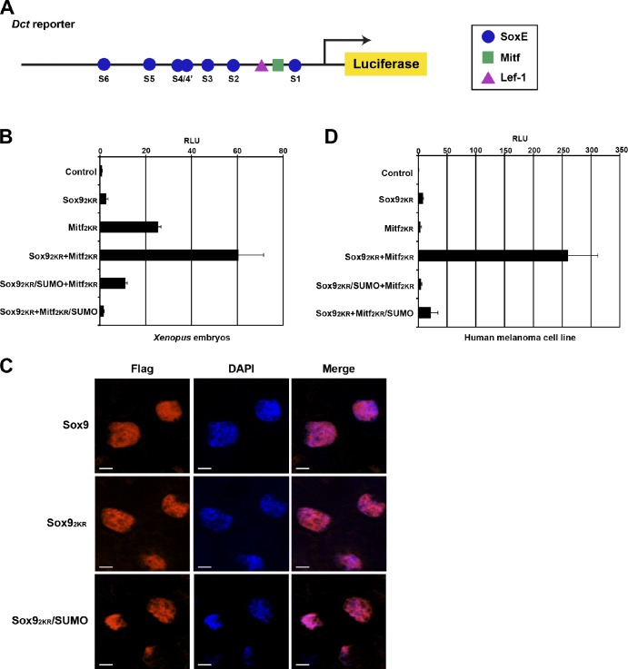 Figure 2. Effects of Sox9 and Mitf isoforms on Dct promoter activity and subcellular localization. (A) Schematic of the Dct promoter/reporter containing a Mitf binding site, a Lef-1 site, and six SoxE binding sites, S1, S2, S3, S4/4’ (dimeric sites), S5, and S6, from right to left. (B and C) Luciferase reporter assay in stage 17 embryo lysates (B) or human melanoma cells (C) using the Dct reporter. A Renilla reporter was coinjected for normalization. Relative luciferase activity (RLU) is represented as fold activation relative to the normalized activity of control embryos. Coexpression of non-SUMOylable forms of Mitf and Sox9 activate Dct expression synergistically, whereas SUMOylation of either protein significantly reduced reporter activity. (C) Immunofluorescence staining of animal caps dissected from embryos injected with flag-tagged Sox9 isoforms. Nuclei are marked by DAPI. All Sox9 isoforms colocalized with DAPI, suggesting that SUMOylation does not affect cellular localization of Sox9 in Xenopus embryos. Error bars represent the standard deviation of the mean of triplicate assays. Bars, 10 µm. |