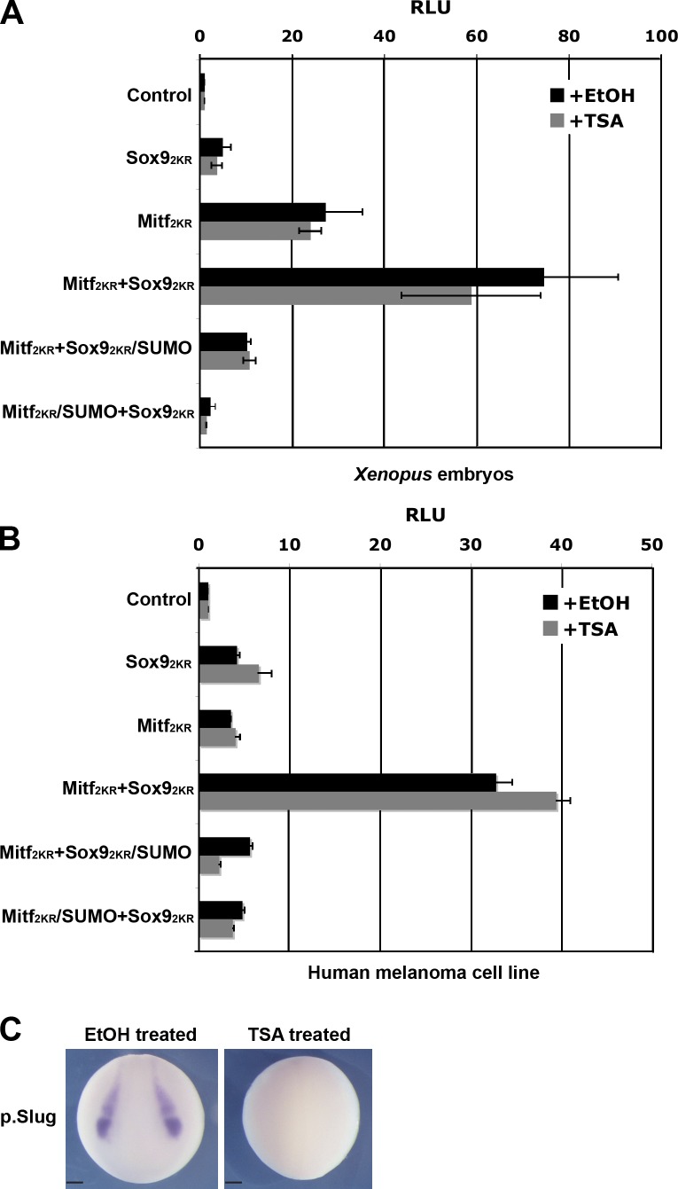 Figure 4. Blocking HDAC activity does not relieve SUMO-mediated inhibition of the Dct promoter. (A and B) Luciferase reporter assays in stage 17 embryo lysates (A) or human melanoma cells (B) using the Dct reporter. Sox9 and Mitf isoforms were coexpressed in the presence or absence of HDAC inhibitor trichostatin A (TSA). Treatment with TSA did not relieve Dct inhibition mediated by either Sox92KR/SUMO or Mitf2KR/SUMO. Error bars represent the standard deviation of the mean of triplicate assays. (C) In situ hybridization showing TSA treatment was effective, as it caused expected loss of Slug expression in stage 17 embryos. Bars, 200 µm. RLU, relative luciferase activity. |