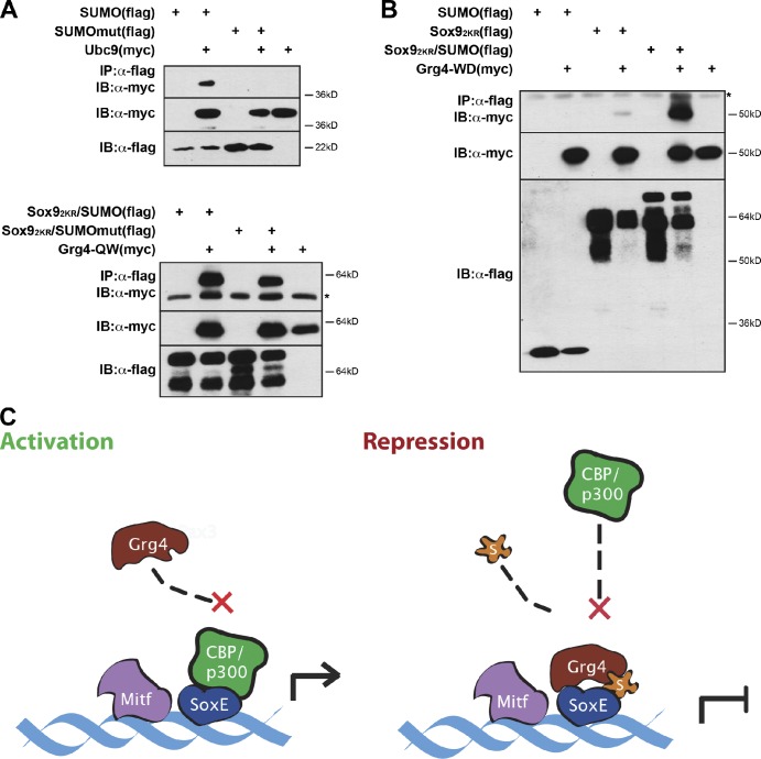 Figure 7. SoxE-SUMO recruits Grg4 by a novel bivalent mechanism. (A) Mutation of an essential SIM-interacting residue on the SUMO moiety (SUMOmut and Sox92KR/SUMOmut) abolishes interaction with UBC9 but not with Grg4QW, which includes the poly-Q and WD domains. (B) Coimmunoprecipitation from Xenopus lysates showing that neither SUMO nor Sox9 is sufficient for robust interaction with Grg4. Strong interaction requires surfaces on both SUMO and Grg4. (A and B) Asterisks denote IgG bands. (C) Model describing the mechanism underlying SUMO-mediated modulation of SoxE function. SUMOylation of SoxE converts it from a transcriptional activator to a repressor by displacing coactivator CBP/p300 and recruiting corepressor Grg4 via a multivalent interaction. |