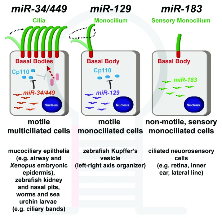 Figure 1. Specific expression of microRNAs in ciliated cell types. The miR-34/449 family is expressed in mucociliary multiciliated cells, where it inhibits cp110 to promote ciliogenesis of motile cilia (left). miR-129 is required for inhibition of cp110 and ciliogenesis of motile mono-cilia (middle). The miR-183 family is expressed in non-motile ciliated neurosensory cells, but their precise role is not elucidated yet (right).