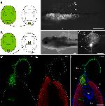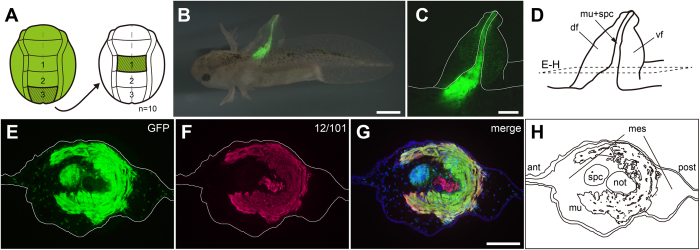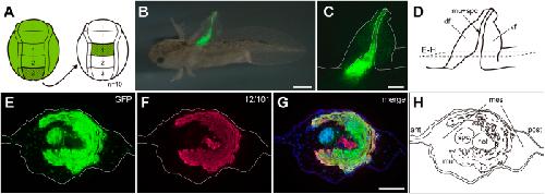 Figure 4. Heterotopic grafting of plate region3 into plate region 1 area gives rise to an ectopic tailfin.A, operation schematic. B and C, an ectopic tail is formed from the GFP+ graft in the anterior trunk (C, enlarged); overlay of fluorescence and bright field images. D, schematic indicating transverse (E–H) sectioning planes through ectopic tail. E, distribution of GFP+ cells derived from grafted GFP+ plate region3. F, myotome cells detected with 12/101 antibody. Red dot in notochord is due to unspecific staining. G, merged images; the ectopic tail contains GFP+ cells in spinal cord, muscle and mesenchyme but not in notochord. Number of experiments: 10. Abbreviations: ant, anterior; post, posterior; spc, spinal cord; not, notchord; mu, muscle; df, dorsal fin; vf, ventral fin; ant, anterior; post, posterior. Scale bars, 1 mm (B), 500 mm (C and G). |