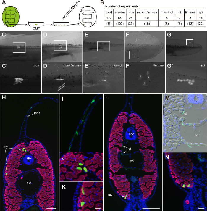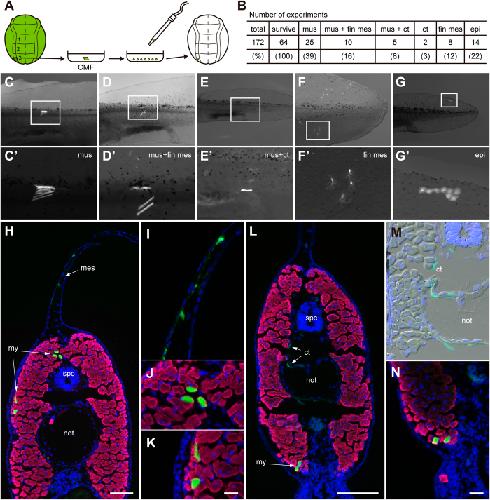 Figure 7. Grafted single GFP+ neural fold reg3 cells reveal mesodermal but no pigment cell traits in the host tailfin.A, Schematic of experimental procedure. Single neural fold cells were isolated from a dorsal neural fold explant (left middle to posterior region3) of a GFP+ donor (stage 15) and grafted homotopically into a white host (stage 15). B, summary of experimental results; frequency of GFP+ cells in tail tissues of host larvae (stage 41, 1 cm); tissues: mus, muscle; fin mes, fin mesenchyme; ct, connective tissue; epi, epidermis. C–G, types and frequency of GFP+ tissues that had developed from a single grafted neural fold region3 GFP+ cell in tail regions of living axolotl hosts (stage 41, 1 cm); bright field/FITC. C’–G’, higher enlargements of boxed areas in C–G. C and C’, only muscle cells (39%); D and D’: muscle and fin mesenchyme cells (16%); E and E‘: muscle and connective tissue (8%); as the connective tissue is located inside the larva it is dim and insharp in wholemount images; F and F’: only fin mesenchyme (12%); G and G’: epidermis (22%). H and L, Transverse sections through tails of larvae shown in D and E, respectively. I–K, higher enlargement of GFP+ fin mesenchymal and muscle cells from H. M–N, higher enlargement of connective tissue (M) and muscle cells (N) from L . H–L and N, merged images of GFP, 12/101 (red) and Dapi. M, merged image of GFP, bright field and dapi. Scale bars, 200 μm (H and L) and 50 μm (K and N). I–K and M–N have the same magnification. |