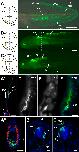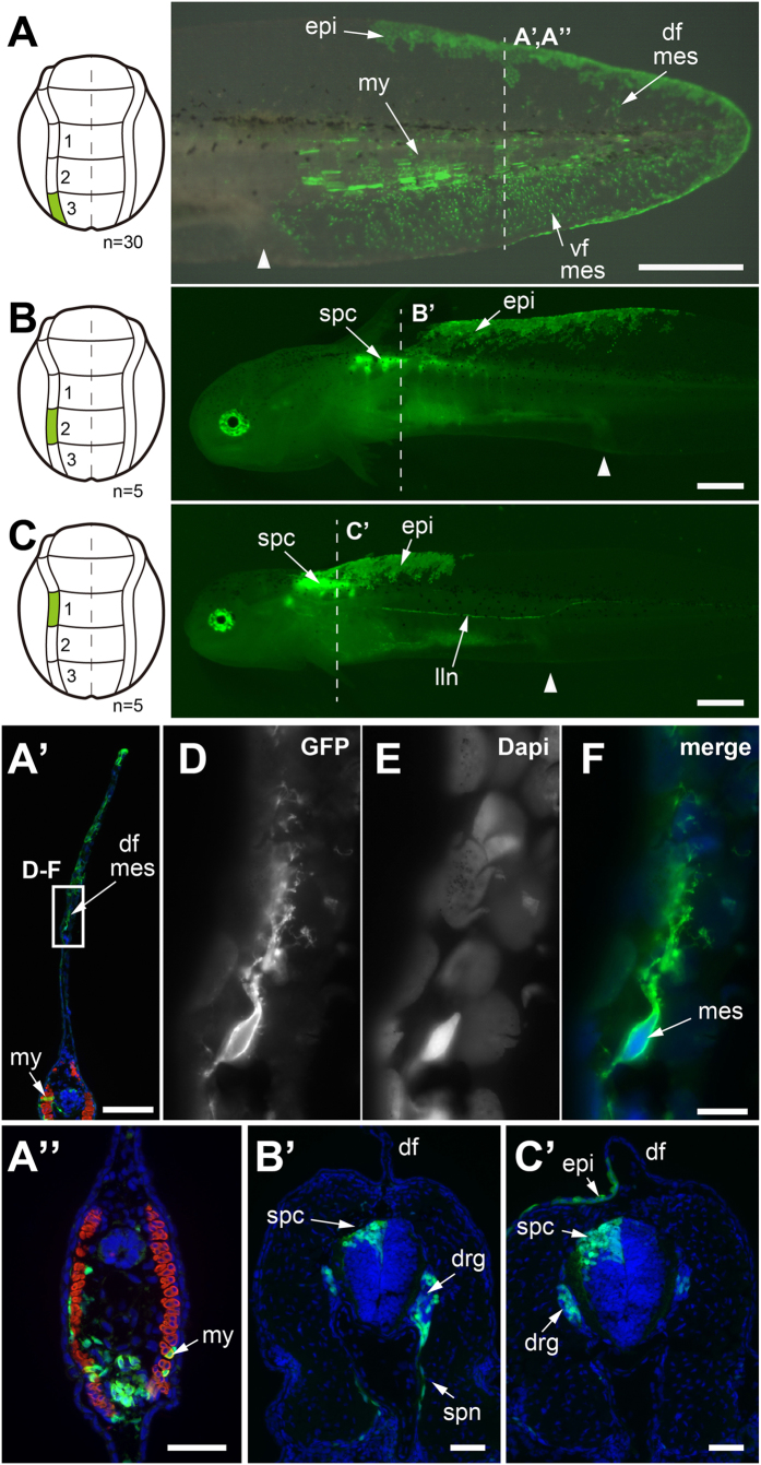 Figure 3. Results of fate mapping experiments of neural fold in the axolotl neurula (stage 15).Only posterior trunk neural fold regions contribute to posterior trunk/tail muscle and fin mesenchyme. A-C, homotopic transplantation of three defined GFP+ neural fold regions (accentuated in green) from a GFP+ donor (stage 15) to a white (d/d) host (stage 15) and visualization of graft-derived GFP+ cells in larvae at stage 41 (1 cm length). White arrowheads indicates position of cloaca in larvae. A’–C’ and A”, transverse cryosections through larvae shown in A–C containing GFP+ grafts; dashed lines in A–C indicate sectioning planes; sections are overlays of fluorescence images. Dapi, blue; anti-12/101 (muscle), red; anti-GFP, green. A, A’ and A”, GFP+ region3 fold gives rise to few muscle cells in tail myotomes, to few mesenchymal cells in the dorsal and ventral tailfin and to some tail epidermis (upper and lower seam of tailfin). B and B’, GFP+ region2 fold contributes cells to the spinal cord, dorsal root ganglia and fin epidermis in the mid trunk. The labelling of the epidermis is not visible here in B‘ but optimal further posteriorly to the ganglia (see Fig. S1). C and C’, GFP+ region1 gives rise to cells in the spinal cord, dorsal root ganglia, fin epidermis and to the middle lateral line nerve in the anterior trunk. D–F, higher enlargements of boxed area in A’. Presence of GFP+ mesenchymal cells in the dorsal tailfin after grafting GFP+ fold region3. Number of experiments: A, 30; B, 5; C, 5. Abbreviations: df, dorsal tail fin; vf: ventral fin; mes: mesenchymal cell; my, myotome; epi, epidermis; spc, spinal cord; lln, lateral line nerve; drg, dorsal root ganglia; spn, spinal nerve; not, notochord. Scale bars, 1 mm (A–C), 200 μm (A’), 20 μm (F) and 100 μm (A”, B’, C’). |