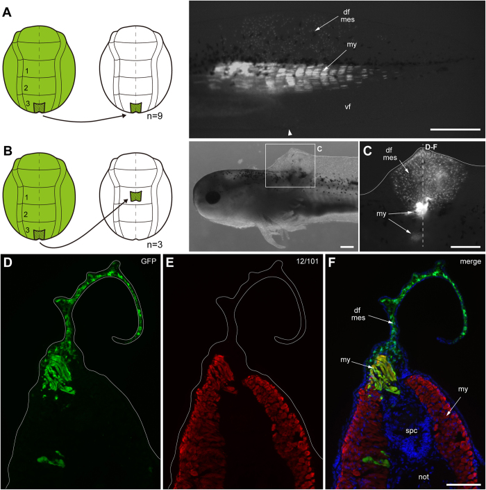 Figure 5. Central part of the posterior region 3 plate gives rise to fin mesenchyme and muscle.Homotopic transplantation (A) and heterotopic transplantation (B) of medial GFP+ neural plate tissue from the posterior region 3 of a GFP+ donor (stage 15) to a white (d/d) host (stage 15). A, visualization of graft-derived GFP+ cells in the myotomes (my) of the posterior trunk and anterior tail of a host at stage 41; dorsal fin mesenchyme (mes) is also GFP+; white arrowhead points to position of cloaca. B–F, visualization of GFP+ cells in the dorsal fin of the anterior trunk of a host at stage 41. D–F, demonstration of GFP+ fin mesenchyme (mes) and striated paraxial muscle on transverse sections (plane indicated in C). White lines in C–E help to see the outlines of dorsal parts of larvae. Number of experiments: A, 9; B, 3. Abbreviations: df, dorsal fin; vf, ventral fin; mes, mesenchyme; my, myotome; spc, spinal cord; not, notochord. Scale bars: 1 mm (A), 500 mm (B and C) and 200 mm (F). |