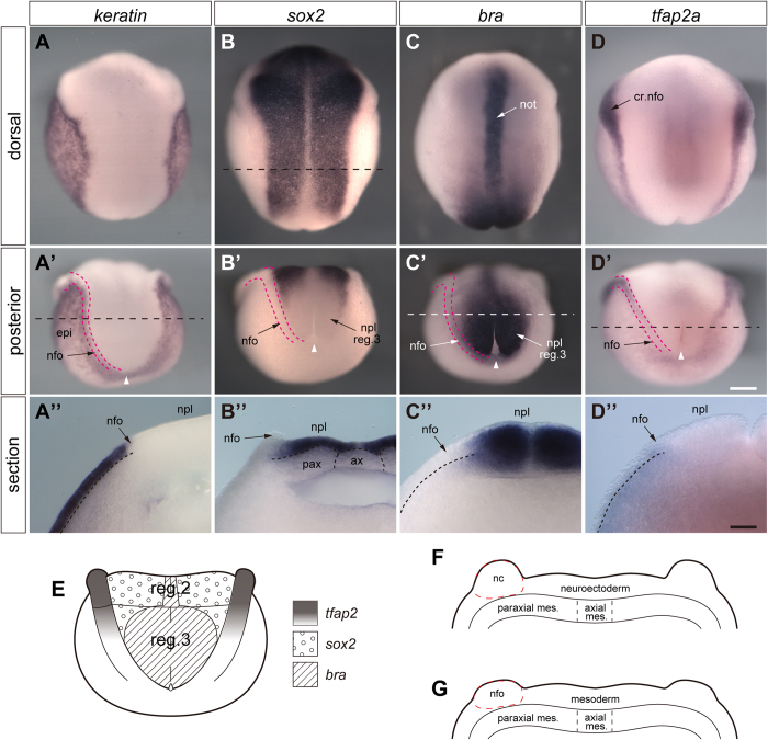 Figure 6. Expression of molecular markers for epidermis, mesoderm, and neural crest.In situ hybridization of axolotl neurulae (stage 15) with keratin (A, Aâ), sox2 (B, Bâ and Bâ), brachyury (C, Câ and Câ) and tfap2a (D, Dâ and Dâ) riboprobes. AâD, dorsal views of whole embryos. AââDâ, posterior views of whole embryos. AââDâ, posterior aspects of anterior halves of bisected embryos. Sectioning planes are indicated by dashed lines and run through the middle of region 3 fold/plate (Aâ, Câ and Dâ) or through region 2 (B). Red double-dashed lines indicate neural folds; prospective epidermis is lateral and neural plate medial to the folds. E, fate of plate/fold region3 based on in situ hybridization with brachyury (bra), sox2 and tfap2a riboprobes (neurula stage 15). Brachyury: positive in the centre of plate region 3; tfap2a: positive.in cranial and trunk neural folds until the anterior part of fold region 3; sox2: positive in cranial and region 2 plate. F and G, transverse sections through neural fold/plate (stage 15) in region 1â2 (F) and middle of region3 (G). Axial differences of neural plate and neural crest potential become evident (neuroectoderm vs. mesoderm and neural crest vs. neural fold, respectively). These data and the indication of the distribution of the tfap2-, sox2- and bra-zones in E are based on in situ hybridization (see above). nc in F, prospective neural crest; nfo in G, tfap2a-negative neural fold tissue, probably mesoderm. Number of experiments: about 20 for each riboprobe. White arrowheads in Aâ-Dâ point to blastopore. Abbreviations: not, notochord; nfo, neural fold; cr. nfo, cranial neurl fold; npl, neural plate; ax, axial mesoderm; pax, paraxial mesoderm. Scale bars, 500âμm (Dâ) and 200âμm (Dâ). |