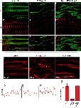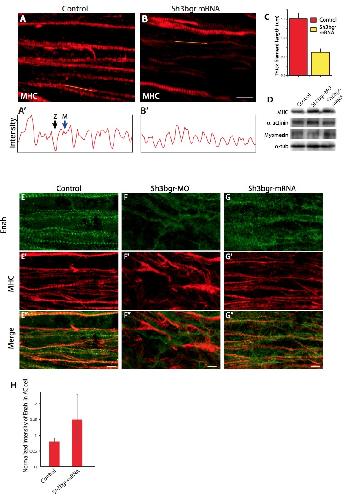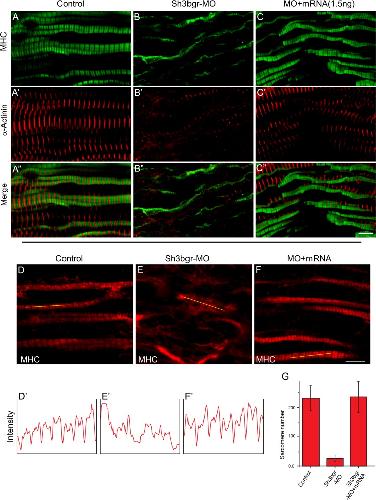 Fig. 3. sh3bgr is necessary for sarcomere formation. AâC. Stage 33 embryos were fixed and the coronal sections of somitic tissues were stained for α-actinin (Red) and MHC (Green). Knockdown of sh3bgr caused severe defects in the sarcomeres. Sh3bgr knockdown caused almost compete loss of sarcomere structures (B). Co-injection of Sh3bgr mRNA (1.5ng) with Sh3bgr-MO rescued sarcomere defects (C). DâF. Representative images of thick filaments. The fluorescent intensity plots of indicated muscle fibers are shown in (DââFâ). The average numbers of intact sarcomeres in each sample are shown in (G). Scale bar = 5 µm |