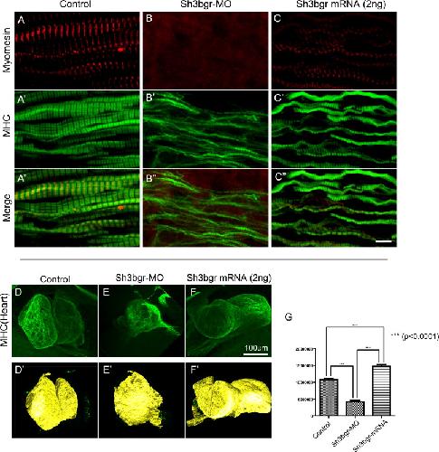 Fig. 4. Overexpression of Sh3bgr caused abnormal sarcomere formation and increased heart volume. AâC. Stage 33 embryos were fixed and the coronal sections of somitic tissues were stained for myomesin (Red) and MHC (Green). Overexpression of sh3bgr (2ng of Sh3bgr-flag mRNA) caused abnormally discontinuous thick filaments and mislocalizaiton of myomesin. D-F. Overexpression of Sh3bgr increased the heart volumes. The embryonic hearts were stained with anti-MHC antibody and the volumes of Stage 45 embryos were measured using the Imaris program. DââFâ. The surface views of 3D confocal images in (DâF) rendered using the Imaris program. The heart volume was plotted in (G). The numbers of embryos analyzed: Control-13, sh3bgr morphants-13, Rescue-13. Scale bar = 5 µm |