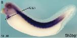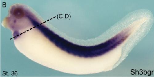sh3bgr (SH3 domain binding glutamate-rich protein) gene expression in Xenopus laevis embryo, assayed via in situ hybridization, NF stage 30, lateral view, anterior left, dorsal up. |