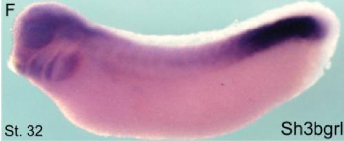 sh3bgrl (SH3 domain binding glutamate-rich protein like) gene expression in Xenopus laevis embryo, assayed via in situ hybridization, NF stage 32, lateral view, anterior left, dorsal up.
