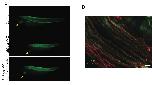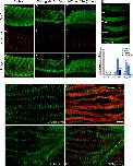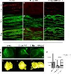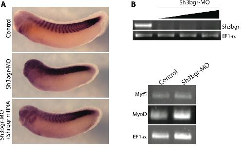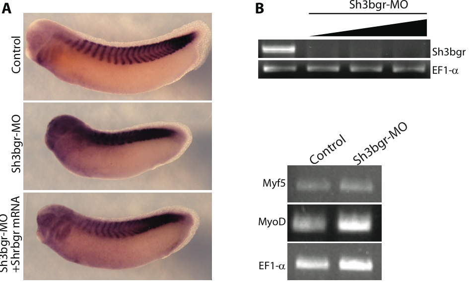 Fig. 2. Knockdown of sh3bgr caused severe defects in somite development. AâC. Microinjection of sh3bgr antisense morpholino (Sh3bgr-MO; 50 ng per embryo) disrupted normal somite development. The somite boundaries were labeled with anti-integrin-β1 antibody (Red) and the muscle fibers were stained with the myosin heavy chain (MHC) antibody (Green) at Stage 33. D. The muscle phenotypes were categorized according to the severity. Weak; the chevron pattern is partially disrupted, Severe; the chevron pattern is completely lost. Very severe; the somatic tissue is severely hypomorphic. The muscle defects in the morphants were recovered by co-injection with 1.5 ng of sh3bgr mRNA. The numbers in the graph are the percentage of the embryos. The numbers of embryos analyzed: Control-13, sh3bgr morphants-26, Rescue-35. E-Eâ. Sh3bgr localizes to the muscle fibers. 150ng of Sh3bgr-flag mRNA was injected into Stage 2 embryos. Stage 33 embryos were fixed and the coronal sections of somitic tissues were stained for MHC (Red) and Sh3bgr-flag (Green). FâFâ. Sh3bgr-flag fusion protein localized to the Z-line in sarcomeres. Sh3bgr-flag (Green) was co-immunostained with α-actinin (Red). The yellow line indicates a somitic boundary. Scale bar = 5 µm |