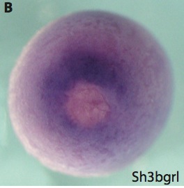 sh3bgrl (SH3 domain binding glutamate-rich protein like) gene expression in Xenopus laevis embryo, assayed via in situ hybridization, NF stage 12, blastoporal view, dorsal up. |