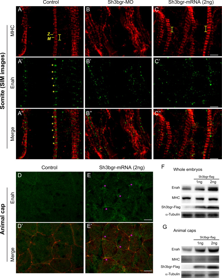 Fig. 5. Sh3bgr is an upstream regulator of Enah. AâC. Super resolution SIM images of sarcomeres in control (A) Sh3bgr knockdown (B), and Sh3bgr overexpressing embryos (C). Enah protein was labeled in green and MHC was labeled in red. The Z-line and M-band are indicated within a sarcomere. Both knockdown and overexpression of Sh3bgr delocalize Enah from the Z-lines. DâE. Enah staining in control (D) and Sh3bgr overexpressing (E) animal cap cells. In Sh3bgr overexpressing animal cap cells, the Enah protein is highly enriched in tri-junctional foci (asterisk). FâG. The western blot analysis showed that the endogenous Enah protein level was sharply increased in whole embryos (F) or animal cap tissues (G) upon overexpression of Sh3bgr. Scale bar (AâC) = 2µm Scale bar (D, E) = 10 µm. |