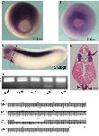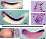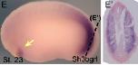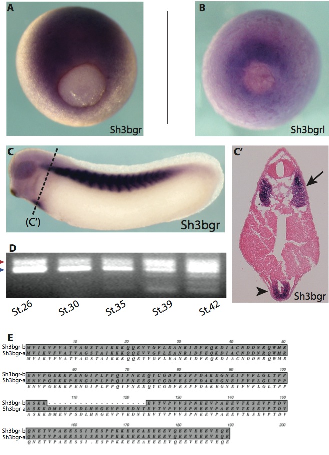 sh3bgrl (SH3 domain binding glutamate-rich protein like) gene expression in Xenopus laevis embryo, assayed via in situ hybridization, NF stage 23, lateral view, anterior right, dorsal up (E) and section through tail bud region (E'), dorsal up. |