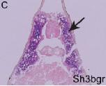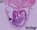 Fig. 1. sh3bgr is expressed in the skeletal muscles and heart tissues. Whole mount in situ hybridization showing that sh3bgr is expressed in the somites and heart at Stage 30 (A), Stage 36 (B). C, D. Sectioned samples shown in (B). E. sh3bgrl is expressed in the presomitic tissue and early cardiac tissue at Stage 23. F. At Stage 32, sh3bgrl is expressed in the pharyngeal arches and the presomitic expression was maintained. |