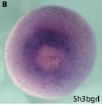 sh3bgr (SH3 domain binding glutamate-rich protein) gene expression in Xenopus laevis embryo, assayed via in situ hybridization, NF stage 11, blastoporal view, dorsal up. |
