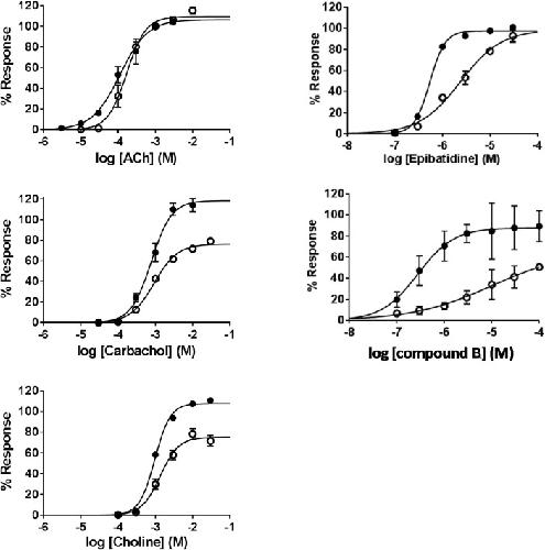 Fig 4. Concentration-response curves of nAChR agonists on human α7 and α7β2 nAChRs in Xenopus oocytes.Acetylcholine (ACh), carbachol, choline, epibatidine and compound B were applied in various concentrations to Xenopus oocytes expressing α7 (filled circles) and α7β2 (1:10, empty circles) nAChRs. All responses were normalized to the peak amplitude of a 1 mM control ACh-induced ion current in the respective oocyte.
