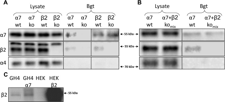 Fig 1. Bead-coupled α-bungarotoxin selectively purifies α7-containing nAChRs from mouse cortex.(A) Affinity purification was performed with bead-coupled α-bungarotoxin (α-Bgt) on cortical homogenates from α7+/+, α7-/-, β2+/+, and β2-/- mice and the isolated proteins were separated using gel electrophoresis. Subsequent detection using Western blotting demonstrated the presence of the α7 and β2 in the isolates from α7+/+ and β2+/+ mice. In isolates from α7-/- mice none of these proteins were detected, demonstrating that α-Bgt specifically isolates α7-containing nAChRs, and that the detection of β2 is dependent on the presence of α7 protein. In isolates from β2-/- mice, there was no detection of β2 protein, confirming the identity of the band isolated using α-Bgt as being β2. The α4 subunit was not detected in any of the isolates, confirming that the presence of β2 protein is not due to non-specific isolation of α4β2 nAChRs. In the original tissue lysates α7, β2, and α4 protein was readily detectable, except that β2 is not detected in β2-/- lysates, demonstrating the specificity of the antiserum. A 55 kDa protein was detected in both α7+/+ and α7-/- lysates, as has previously been shown for several other α7 antibodies [26,27]. (B) α-Bgt affinity purification on cortical homogenates from α7+/+ and a mixture of α7-/- and β2-/- mice. β2 subunits were not detected in the latter. (C) Detection of β2 is evident in HEK293 cells transfectd with the human β2 gene (HEK β2), but not in untransfected cells (HEK). Similarly transfection of GH4 cells with human α7 (GH4 α7) does not alter detection of the band corresponding to β2.