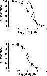Fig 5. Effect of antagonists on human α7 and α7β2 nAChRs in Xenopus oocytes.Inhibition curves for dihydro-β-erythroidine (DhβE) and methyllycaconitine (MLA) on α7 (filled circles) and α7β2 (1:10, empty circles) nAChRs. Co-expression of α7β2 nAChR subunits lead to a significantly decreased IC50 for DhβE (P<0.01), and an increased IC50 for MLA (P<0.05) compared to α7 nAChR homomers.
