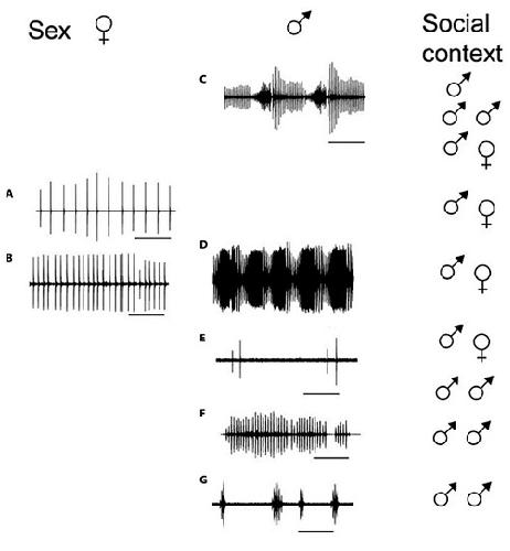 Figure 1. The sex-specific vocal repertoire of X. laevis illustrated as oscillograms (sound intensity versus time). A Female ticking. B Female rapping. C Male advertisement calling. D Male answer calling. E Male amplectant calling. F Male growling. G Male chirping. Scale bars are 500 ms except for F and G (250 ms). Calls are made up of trains of sound pulses that form distinctive temporal patterns. The male advertisement and answer calls include fast and slow trill portions and are thus biphasic; other calls are monophasic. Advertisement and answer calls are intensity-modulated; other calls are not. Though shown here normalized to maximum pulse intensity for clarity, some calls are loud (advertisement calls and rapping, for example) and some are soft (ticking and amplectant calls). The male advertisement call is given when alone or in the presence of conspecifics of either sex. Other call types are context specific and depend on the sex and reproductive state of the partner (social context). Modified from Zornik and Kelley [2011].