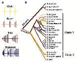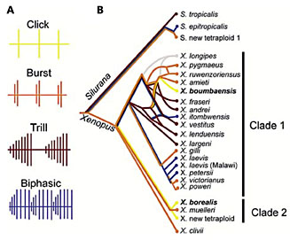 Fig. 2. A Male advertisement call temporal patterns range in complexity from single sound pulses repeated at long intervals (click patterns) to temporally complex biphasic calls. B Mapping of advertisement calls onto the molecular phylogeny of the Xenopodinae reveals that advertisement call patterns are homoplasious. For example, burst-type calls occur in all branches of the phylogeny. A parsimony analysis suggests that the moderately complex burst-type advertisement call structure is ancestral. This figure is reproduced from Leininger and Kelley [2013].
