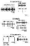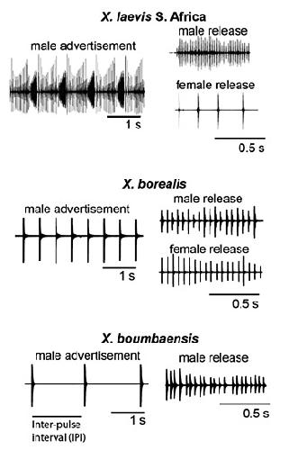 Fig. 3. Advertisement and release calls from X. laevis, X. boumbaensis, and X. borealis illustrate diversity in vocal sex differences in call complexity and IPI. In X. laevis (top), male advertisement and release call IPIs exceed those of females, and male calls are more temporally complex than female calls. X. boumbaensis (middle) and X. borealis (bottom) have temporally simplified male advertisement calls, with long IPIs. X. boumbaensis vocal sex differences are extreme, because females do not produce release calls. X. borealis vocal sex differences are reduced, as female and male release call IPIs do not differ significantly. Adapted from Leininger et al. [2015].