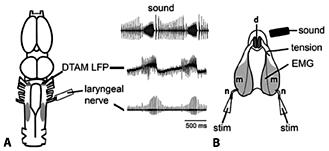 Fig. 4. Ex vivo preparations of the isolated brain and larynx. A Laryngeal nerve activity recorded from the isolated male X. laevis brain matches the pattern of sound pulses of the biphasic advertisement call. An LFP wave in the premotor nucleus DTAM coincides with fictive fast trill. B The isolated vocal organ (larynx) produces sound pulses (recorded with a hydrophone) when the laryngeal nerves (n) are stimulated, the muscles (m) contract, and the arytenoid disks (d) separate.