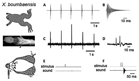 Fig. 5. Physiological bases of advertisement call production in X. boumbaensis. On the left, the preparation is indicated. The upper panel illustrates the calls; the middle panels show recordings from the laryngeal nerve (arrowhead) as it exits the brain; the lower panel illustrates results of electrically stimulating the laryngeal nerve (1.) and recording sounds (3.) produced by movements of the arytenoid disks (2.). A Sound oscillogram of the male X. boumbaensis advertisement call. The call is a series of sound pulses repeated at long (>1 s) intervals. B Enlargement of a single sound pulse. C 5-HT-evoked laryngeal nerve recordings from the isolated X. boumbaensis brain reveal neural activity repeated at call intervals (compare to A). D Enlargement of one instance of neural activity in C. Nerve activity is composed of compound action potential doublets. E Single stimuli delivered to the laryngeal nerve rootlets are not sufficient to cause sound pulse production. F Doublet stimuli approximating the temporal parameters of the compound action potential doublets is sufficient to produce a single sound pulse. Adapted from Leininger and Kelley [2013].