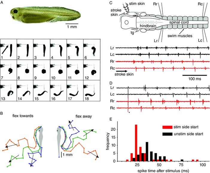 A, tadpole and video frames (150 frames sâ1) showing a tadpole viewed from above responding to touch on the left side of the head with a fine hair (arrow) by flexing to the left (frames 4â10) and then swimming off (frames 14â18). B, tracings from six similar videos after head stimulation on the left side (asterisk) plot head position to show flexion to left or right and swimming in a range of directions (arrows). C and D, an immobilized tadpole showing the brain, spinal cord and innervation of head skin by a sensory neuron in the trigeminal ganglion (tg). The positions of suction electrodes to record ventral root activity from swimming muscles (Rr, Rc, Lr, Lc) and to stimulate the right head skin are indicated. Fictive swimming can start on the stimulated side after touch (arrow, C) or current pulse (asterisk, D) stimulation to the head skin. E, histogram of latencies to the start of swimming in immobilized tadpoles following skin stimulation on the same (red bars) or opposite (black bars) side of the head. Bin size = 5 ms. |