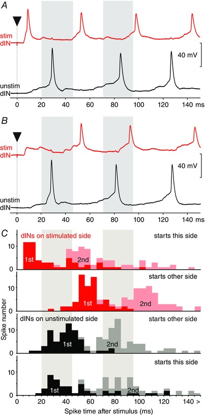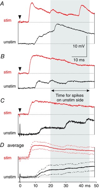 Asymmetry in EPSP responses to low‐level skin stimulation in dINs on stimulated (red) and unstimulated (black) sides