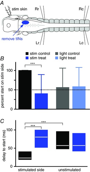 Effects of removing the tIN population on one side on swimming responses to head‐skin stimulation