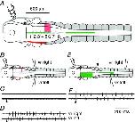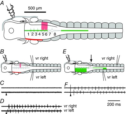 A, summary of regions of the hindbrain where unilateral transection prevented swimming (pink) or where mid‐line cuts (green) still allowed the initiation of bilateral swimming following a head‐skin stimulus applied to the right side (rhombomeres numbered). The trigeminal ganglia on the left side were severed to prevent contralateral sensory access (red line). B, example of a rostral unilateral transection (pink line). C, ventral root recordings show this lesion prevented swim initiation to a head‐skin stimulus (arrowhead) but not to a trunk‐skin stimulus (D). E, example of a mid‐line lesion (green line) that only left a short intact region of caudal hindbrain (arrow). F, this short intact region was sufficient to allow initiation of bilateral swimming following a head‐skin stimulus to the right side. Ventral root recording positions on right (upper traces) and left (lower traces) sides are indicated in B and E. |