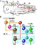 A, brain in dorsal view and the headâskin trigeminal pathways initiating swimming on the same or opposite sides. Dots show locations of the neuron populations, not their real numbers: touchâsensory trigeminal neurons (tSt, yellow), sensory pathway neurons (tIN, pale magenta; rdlc, red), electrically coupled reticulospinal excitatory neurons (dIN, brown). Fb, forebrain; hb, hindbrain; mb, midbrain; m, muscles; oc, otic capsule; sc, spinal cord; tg, trigeminal ganglion. B, functional diagram of the network including the central pattern generator (swim circuit) neurons: inhibitory interneurons (cIN, blue; aIN, purple) and motoneurons (mn, green). Continuous lines indicate evidence for a monosynaptic connection. Dashed lines indicate indirect connections (delay). Large circles represent populations of neurons. Small circles (inhibitory) and triangles (excitatory) are synapses and, when they contact a box, they connect to all neurons in the box. |